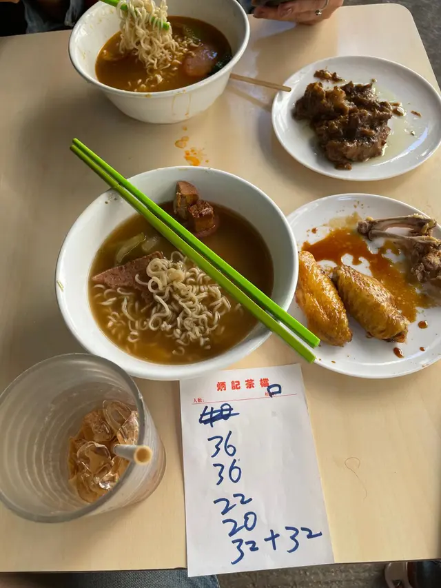 坐下後,有伙計問食乜,我話我未食過,所以問有乜嘢出名好食,她介紹淨食雞翼、豬扒好出名,之後問食乜嘢麵,3餸麵,都多人食,我哋二人就叫咗淨食雞翼及豬扒,2 碗3 餸出前一丁麵,加上一杯凍奶茶及一杯啡走。 伙計冇比餐牌我哋睇,又唔知價錢,我哋就跟個伙計話好食的去叫。