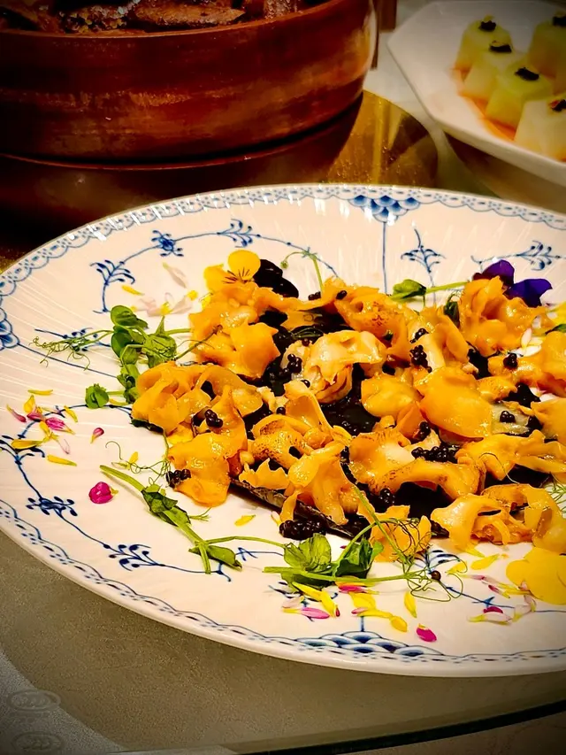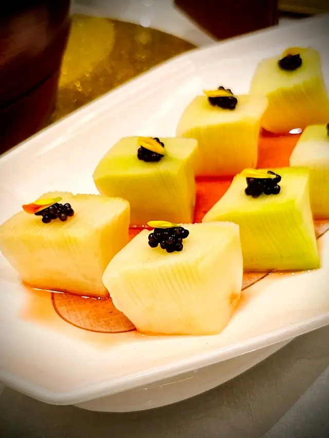 先來兩款精緻開胃前菜 - 椒香脆芥蘭芯 及 頭抽芥末伴海螺片。前者將爽脆芥蘭心切成細片,配上魚子醬,味道帶椒麻香;後者以鹹鮮頭抽及微辣芥末調味海螺片,味道鮮香。