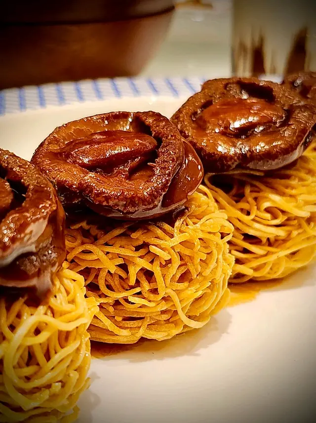 鮑魚肉絲炒麵球,每個脆炸炒麵球上都有一隻肥美鮑魚,食之前可選擇淋上肉絲芡汁。