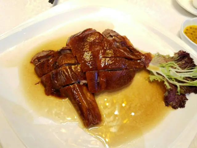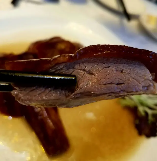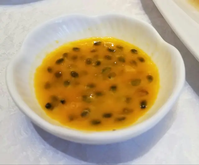 唔知什麼原因,近年差不多所有新開張的粵菜酒家,無論什麼級數,皆自稱出品馳名燒鵝皇及紅燒乳豬,【粵園】也沒有例外。叫了【熱情燒鵝皇 $158 1/4 隻】,落單之前冇留意名字,侍應送上燒鵝時候,伴隨的不是見慣見熟的傳統酸梅醬,而是一碟橙黃色、並混有一粒粒黑色物體的醬汁。大膽試一試味道,酸酸地、有一種獨特的生果香味,原來係用新鮮熱情果打成的果醬,黑色物體就是果核;唔怪得燒鵝名字加入了「熱情」兩字!第一次蘸熱情果醬食燒鵝,味道相當特別,但始終缺少了梅香 ⋯⋯ 在要求下,酒樓也送上一碟傳統酸梅醬,各適其適。