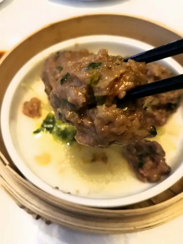 用筷子輕輕夾起牛肉球,已經陷入牛肉球內;細味咀嚼一下,肉質彈牙之中又非常鬆軟,免治牛肉球內充滿空氣,並非那種死死實實的彈牙山竹牛肉,可以說是印象之中最好味嘅牛肉球。處理方法參考老派點心西菜牛肉球,用了西生菜墊底,生菜蒸得軟腍,既有蔬菜的清甜、又盡吸牛肉球滲出來的肉汁;與山竹牛肉球的脆腐皮蒸腍後的少少腐皮香口味道,同樣好味。牛肉球並沒有混入馬蒂粒,少了一點爽口,有些人可能會不喜歡,但卻合正筆者口味。