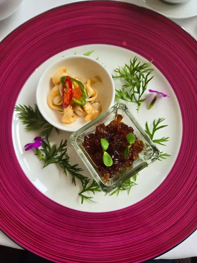 按慣例先吃兩款頭盤,分別是啫喱舟山蜇頭,與及撈汁蟶子。前者清爽帶點醋香,蟶子則帶有麻辣味型,建議梅花間竹的隔著來吃,會平衡得更加好。