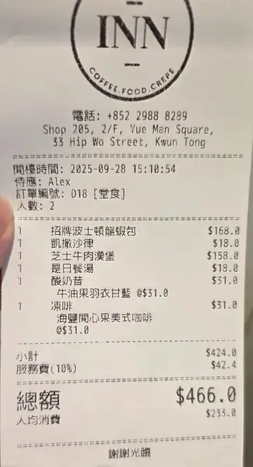 宮廷風格餐廳 foodiesel等级42025-10-0773 views Follow Inn– I’m Not Nothing位於觀塘裕民坊,裝潢走歐式宮廷風格,水晶吊燈與綠植交織出夢幻氛圍,室內庭園區更添悠閒感。芝士牛肉漢堡肉汁飽滿,芝士濃郁,口感層次分明!招牌波士頓龍蝦包鮮甜彈牙,配上微烤麵包,香脆可口。薯條脆卜卜, 非常吸引! $18可選南瓜湯或凱撒沙律及餐飲,南瓜湯香滑暖胃,沙律清新爽口。海鹽開心果美式咖啡鹹香交融,別具風味!羽衣甘藍牛油果酸奶昔則健康滿分,口感細膩!整體餐點精緻,環境舒適,是打卡與聚餐的理想之選。The above review is the personal opinion of a user which does not represent OpenRice's point of view.LikeShare宮廷風格餐廳 INN - I’m Not Nothing (裕民坊YM²) https://s.openrice.com/QrLT0SxPU00Report Post Ratings5Taste5Decor5Service5Hygiene5ValueDining Method堂食