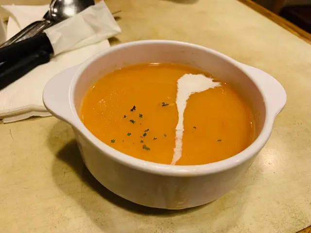我叫左鐵板肉眼扒餐,餐湯有羅宋湯或忌廉湯。蕃茄茸忌廉湯的質地較稀,當是一碗蕃茄湯挺開胃!