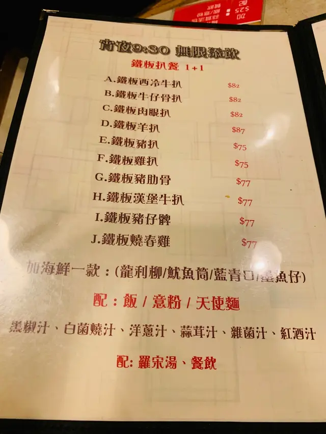 今晚同男朋友屋企人出去太子食晚餐,經過太子冰室門口寫住九點半後鐵板扒餐有宵夜優惠,飲料無限添飲剛好個時係九點四,我地唯有喺附近行下,行到夠鐘先入去