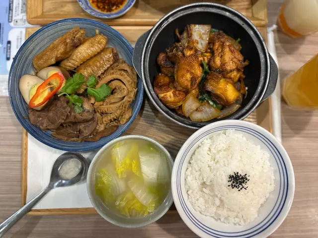 以煲仔盛載的三杯雞香氣撲鼻,雞肉煎至金黃,利用塔香做香料,增添風味。搭配的上湯浸時菜平衡左整體口感。