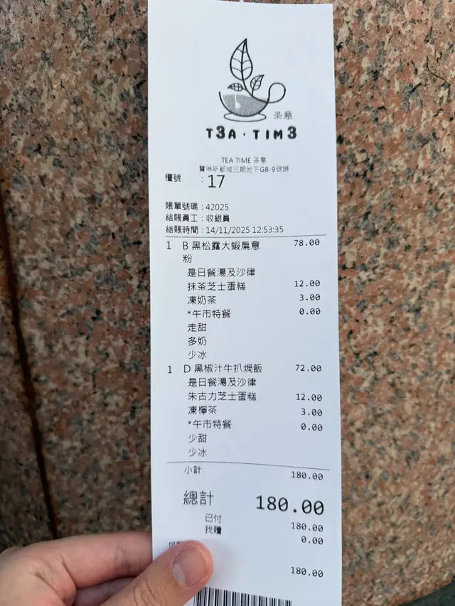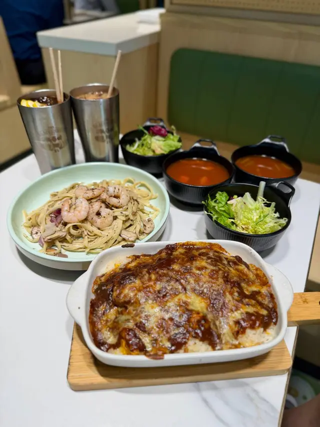 將軍澳街坊茶餐廳 ChubbyBowtie等级42025-11-16223 浏览 关注 呢日喺寶琳想食個快飯,所以就求其入咗一間茶餐廳食個lunch🤣 我同友人一人叫咗一份午市特餐,套餐包括咗一份主食、是日餐湯、沙律同埋餐飲 。主食方面,我哋揀咗黑椒汁牛扒焗飯同黑松露大蝦扁意粉 。焗飯嘅黑椒汁幾惹味,好好送飯 。意粉就聞到好香嘅黑松露味,而且扁意粉都好掛汁🍝黑椒汁牛扒焗飯黑松露大蝦扁意粉黑松露大蝦扁意粉我哋仲額外加咗兩件芝士蛋糕,分別係抹茶同朱古力味🍰 蛋糕味道好有驚喜,冇諗過+$12就食到嘅蛋糕質素,拍得住出面西餅店嗰啲啊 😮嚟茶記就當然要飲港式飲品啦,凍檸茶同凍奶茶都係嚟茶記必飲嘅,茶底唔澀,啱我口味 。61以上食记乃用户个人意见 , 并不代表OpenRice之观点。赞好分享將軍澳街坊茶餐廳 茶意 https://s.openrice.com/QrLT0SJbV00检举 张贴 评分4味道4环境4服务4卫生4抵食用餐途径堂食用餐时段午餐