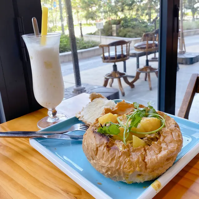 响午餐menu 上揀咗巨型麵包配咖喱牛腩($58)配香芒椰子奶( 特飲+$12)本來都怕個麵包會凍冰冰同死實實,但上枱有驚喜,個麵包好大個呀😍😍(利申:本人係麵包控),唔係🉐️個樣,仲係外脆内軟架🤩🤩而主角咖喱牛腩,咖喱好香,牛腩入味又夠淋,無炸型,連埋個包食一流😋😋唯一敗筆係薯仔多過腩,但鐘意食薯仔嘅朋友,可能仲開心😅😅最後杯香芒椰奶就真係麻麻🤨🤨,只係得幾粒芒果,無乜芒果味,建議可以加小小芒果溶,而椰奶都好似超級市場買返嚟倒落去咁,下次可以試第二個飲品。btw整體食物質素同環境係ok嘅😍😍可以再試👍👍