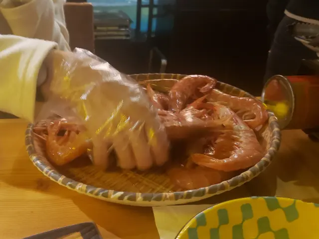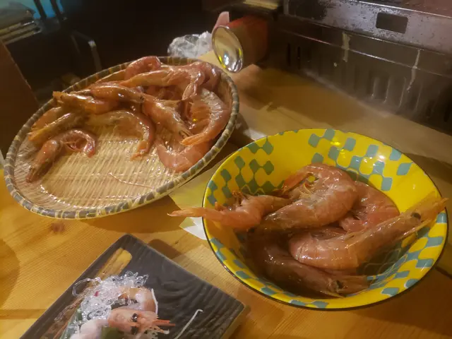 用餐其間。店員捧了一個載滿赤蝦的竹籃來,只要在其面書專頁點讚,便有一次抓海蝦的機會,客人套上手套,一次過以一手抓,抓到多少,便可免費享用多少赤蝦,今次由朋友代勞,共有6只蝦收獲,店員話曾經有一位外藉人士一手便抓了十隻,十分厲害。其實赤蝦的體積也不少,東方人抓到6隻都已經不錯。因為這些赤蝦屬刺身級,所以我們依店員建議一半用來燒,一半作刺身,味道鮮甜啖啖肉,真是一個又好玩又好食的體驗。