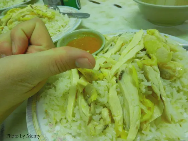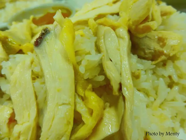 點了份最簡單也最能考量質量的雞飯,賣相相當一般,大大分的炒飯雪雪白配上淺黃色的嫩雞塊,壘得高高,配上一小份泰式醬汁也是淡淡的橘紅色;雞塊應該是由大份撕碎,頗為粗獷的散落與飯“山”上,雞肉與雞皮也幾乎分離,雞肉肉質緊密細緻,白白的雞肉泛著一點點油光,雞皮黃蠟蠟油脂層也較薄,偶爾看到“礙眼”的黃色肥膘;