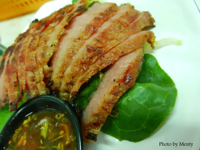 四人食畢雞飯之時也是豬頸肉上桌之時,豬頸肉切得薄薄片,粉紅色的肉質肥瘦均勻,一絲絲的縱橫交錯,邊邊部份烤至微焦,香氣撲鼻;