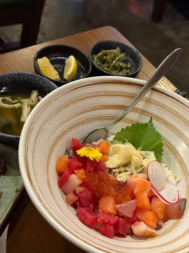 角切魚生飯好足料,有三文魚、三文魚籽、鮪魚及鰹魚飯素,仲叫多份帶子剌身~