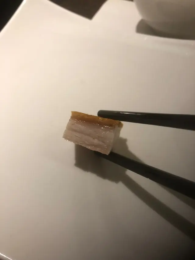 冰燒肉,肉粒四方,砌得十分好看。另外,這與一般燒肉不同,調味恰當,絕不死咸,而且肉脂分佈十分均勻,肉味香濃,脂香四溢,汁液充盈。至於外皮更是精彩,針孔細密平均,皮脆鬆化。芥辣味淡,與燒肉互相輝映。整道菜皮脆肉嫩,真是無懈可撃!