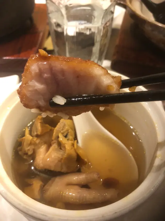 食店裝潢帶有簡約、古雅的味道,光線柔和而充足,令人感到頗舒服。坐下後,友人立刻點了「香蔥醬爆魚腩煲」,以免售罄,無口腹之福。過後,我們又點了「雲吞雞煲」、「冰燒肉」和「淮杞海螺頭湯」。另外,侍應提及如全單以「wechat」點菜,獲95折優待。但可惜,我們已點了魚腩煲,無緣受惠。