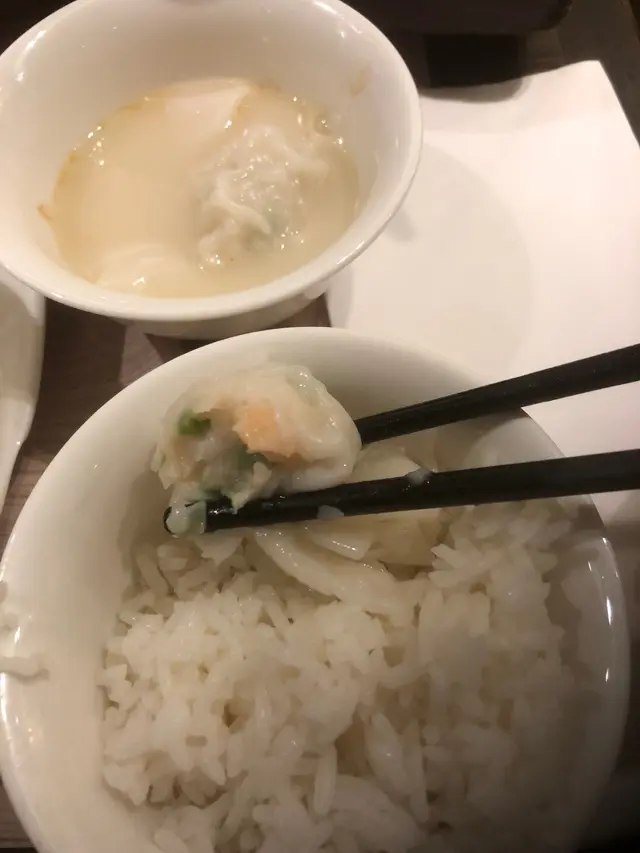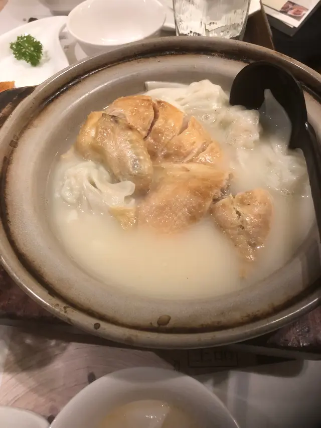 雲吞雞,最特別的地方在於湯底不咸,且有鮮味,味精輕淡,不會讓人口渴。雲吞不是韭菜餡,以白菜代替,再上蝦仁,淡而清鮮,與淡湯互相配合,蠻好吃的。再加上半隻雞,份量十足,而且肉嫩味濃,不會粗糙。另外,這道菜宜肉、湯同吃,否則湯少肉乾,便會浪費佳餚。