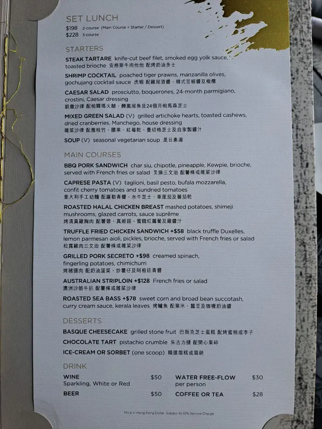 中午時段餐廳提供set lunch,有多款starter、main course及甜品選擇(3-course $198 / 3-course$228,其中幾款主菜有額外收費)。我與朋友選了2款starter,steak tartare及shrimp cocktail, 及2款主菜,Caprese pasta及roasted sea bass(魚需額外加$78)。無論starter及主菜都色香味俱全,頭盤安格斯牛肉他他的牛肉及虎蝦配雞尾酒醬的虎蝦都新鮮,主菜意粉應是手工幼麵,咬落韌度適中。去過2次意大利深度遊,當地吃到的意大利粉非一般香港的意粉可比,而Alto這個意大利粉是正宗口味。主菜意大利粉份量足,配上足量的sun dried tomatoes及水牛芝士,十分滋味。另一個主菜烤鱸魚配粟米、蠶豆及奶油醬,份量亦足,鱸魚又嫩滑,醬汁特別又濃郁。我個人覺得2個主菜都是必食之選,餐廳定價中上不算很平宜,但相比食物份量亦足,不似有些餐廳連主菜都份量不足,有機會吃不飽。以這餐廳食物質素及定價,我會推薦給朋友亦會再來光顧。