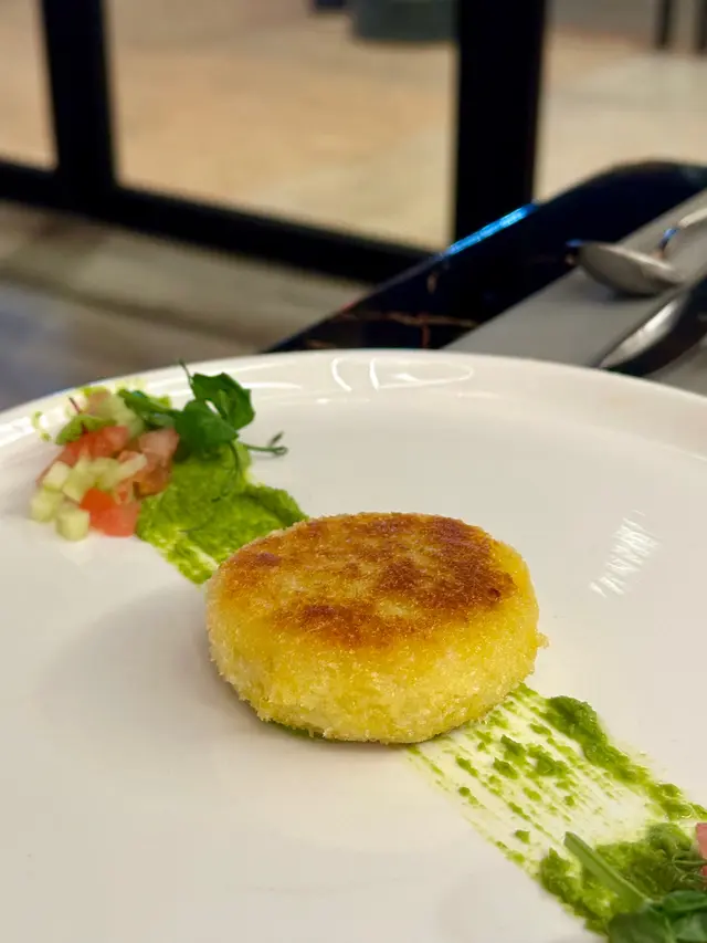 以芝士和豌豆組成的薯餅,煎得兩面香脆,切開豆蓉豐富,加上芝士和蕃茄青瓜沙律,咸咸香香好惹味