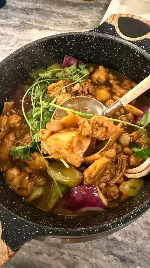 這道菜絕對是全場焦點。雞肉嫩滑多汁,吸滿了香辣濃郁的湯底,麻而不嗆,辣得過癮。湯底以花椒與辣椒為主調,香氣撲鼻,喝一口立刻暖胃提神。配料豐富,還有豆皮、金針菇等吸湯好手,讓人一口接一口停不下來。
