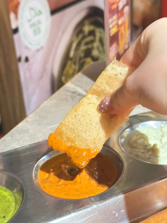Dosa場面超級震撼😂 好長嘅一卷薄脆片,捲到好似圓柱形🙈可以配三款醬汁及印度咖喱食: 椰子醬、蕃茄醬及薄荷芫荽醬!