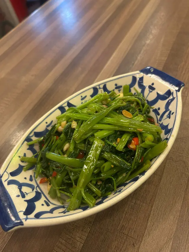 泰式飛天炒通菜鑊氣十足!通菜翠綠爽脆,用咗蝦醬同辣椒爆炒,鹹香惹味得嚟又唔會過鹹。仲有啲蝦米仔增加口感,真係忍唔住一啖接一啖~雖然話係小辣,但唔食得辣嘅朋友都接受到,絕對係送飯首選!
