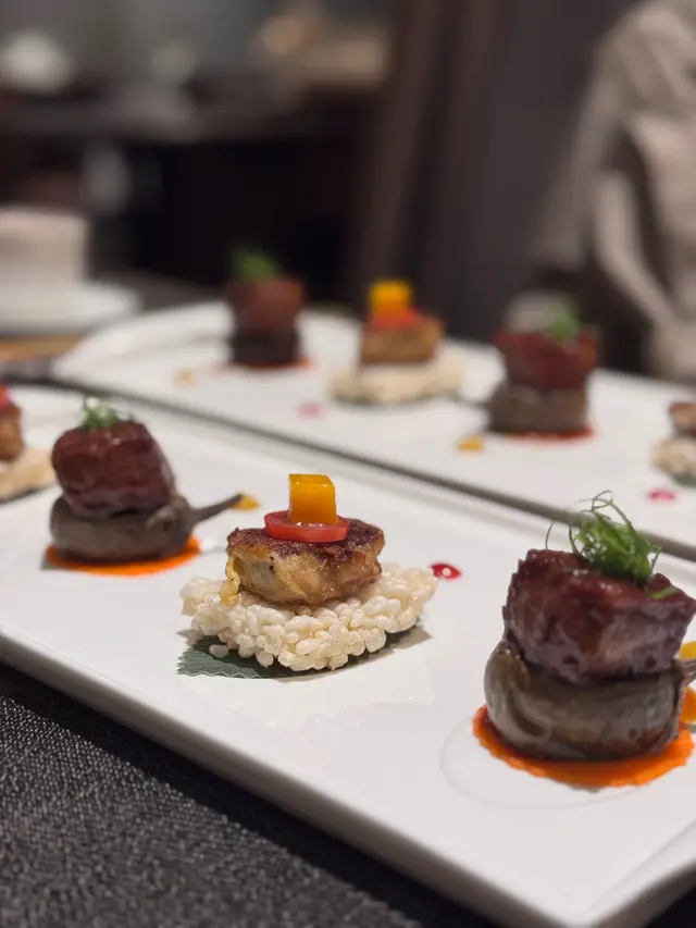 鵝肝醇厚,牛柳鮮嫩,香脆窩粑、茄子清香,奢華享受。最重要係貼心安排位上,擺盤都好靚,方便食用。