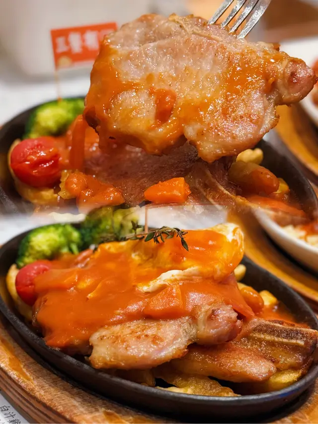 叫咗款懷舊鐵板套餐,包括有餐湯忌廉粟米湯、鐵板主菜、咖啡或者茶,今次叫咗款沙丹豬扒配燴汁,面頭有蛋、火腿、兩大片豬扒同埋薯條墊喺底,成個配搭係好有舊時香港茶餐廳嘅做法,當然份量都唔嘢少啦