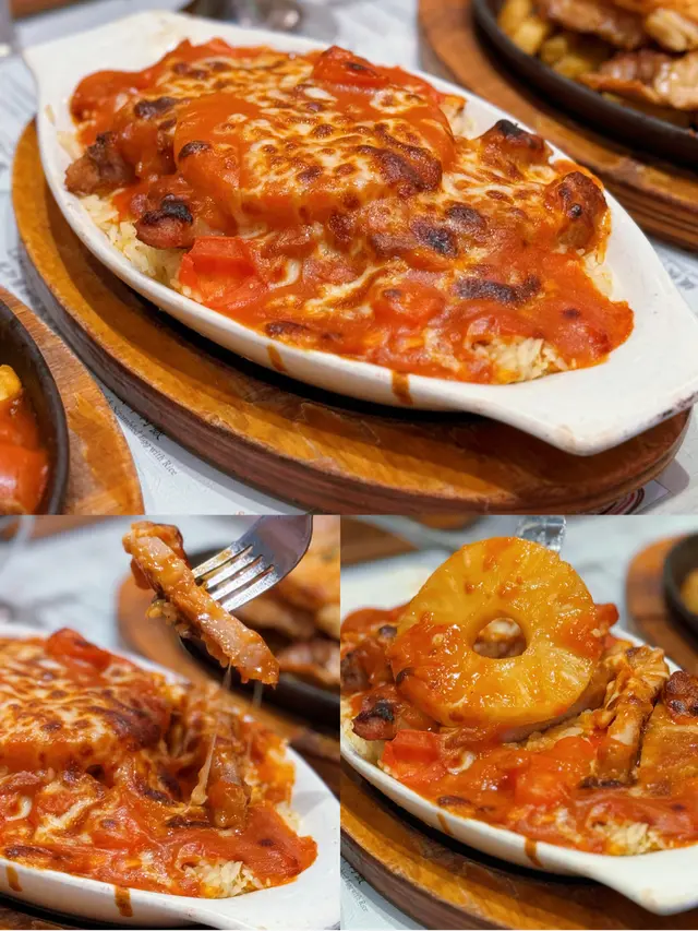 焗豬扒飯上面嘅豬扒厚切,最面頭有一圈菠蘿,用上大粒蕃茄切塊,醬汁酸酸地好開胃,配上炒飯啱啱好