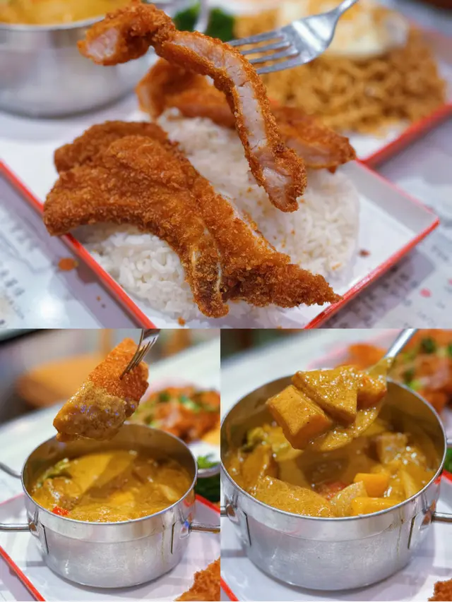 吉列厚切豬扒放喺白飯上面,咖哩薯仔汁就另上,除咗薯仔,入面仲有三色椒同埋洋蔥,豬扒外脆內軟,加埋咖哩薯仔汁食都唔錯,送飯一流