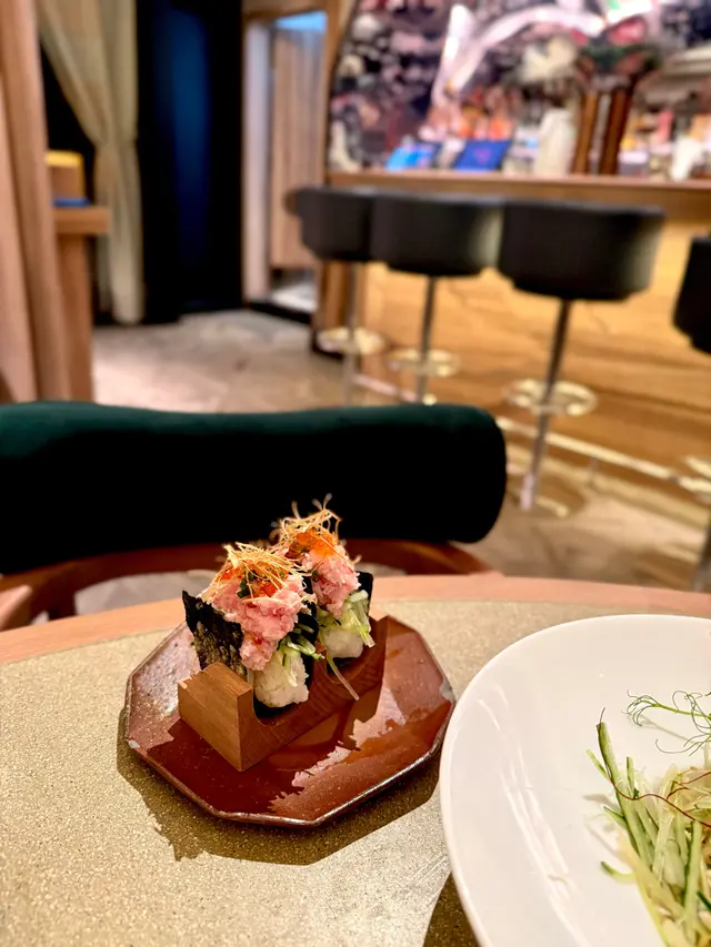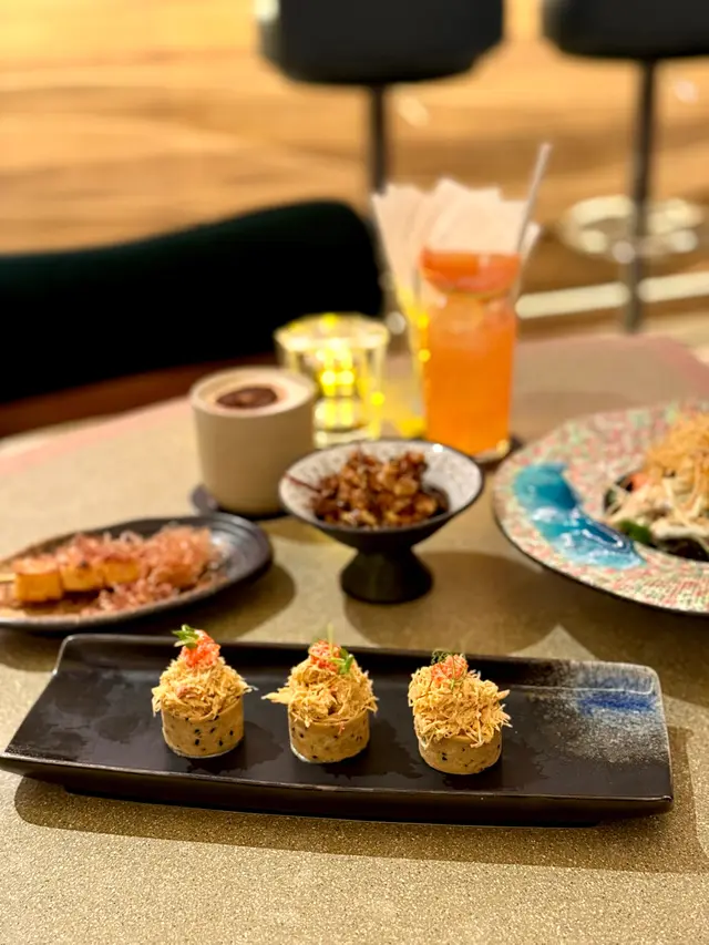 這家日式酒吧「room 3」劃分為3個區域,包括採用竹林設計元素的主用餐區「Akasaka Room」、有竹葉形鏡面吊燈的「Ginza Room」,以及有葉子設計牆壁的「RoppongiRoom」。設計感十足打卡必到📸,在充滿格調的用餐空間內分享多款創意的東瀛美點小食,真的很捨意🫶🏻!