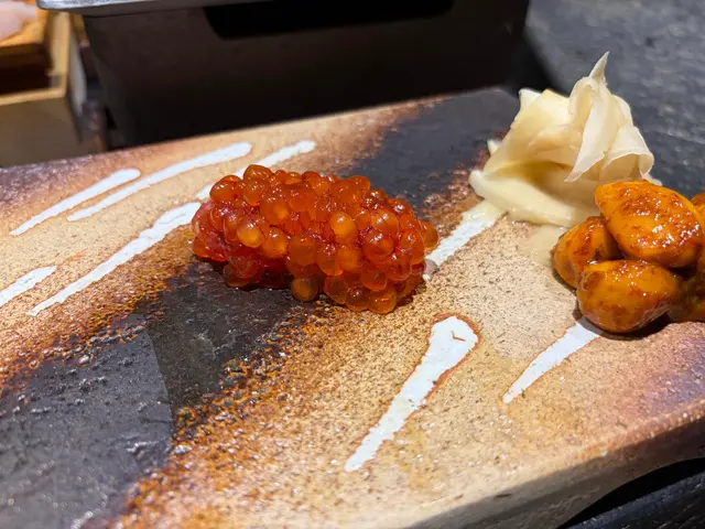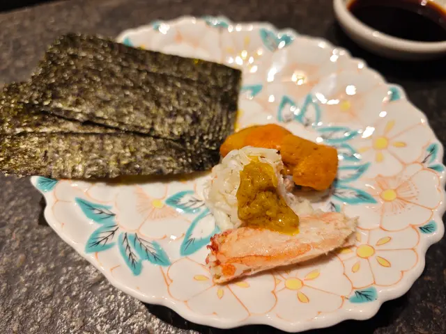 兵庫生蠔肥美綿滑,鱈魚白子奶香濃郁融心。四國鏗魚佐脆洋蔥,層次交織,齒間迸發驚喜。巔峰北海道毛蟹堆蟹膏、海膽、紫菜,奢華四重奏,蟹鮮海膽在舌尖化作雲朵!