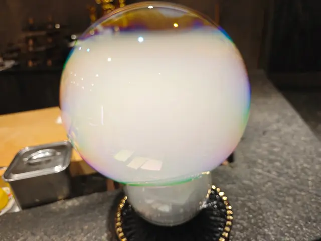 開胃深海池魚淋魚子醬、綴紫蘇花,鮮脆爆汁,紫蘇芬芳,仲有大大個肥皂泡,視覺打卡一流!