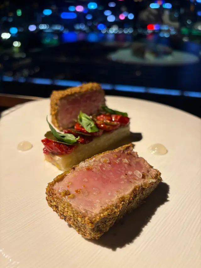 另一道主菜點咗糖醋茄子、油封番茄、開心果醬烤藍鰭鮪魚片,質素都係好好,藍鰭鮪魚嘅魚味好濃郁,切得好厚但又不失柔嫩口感。