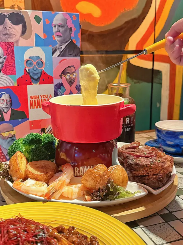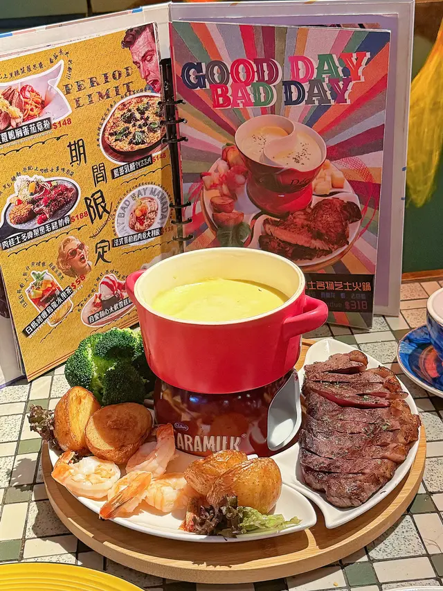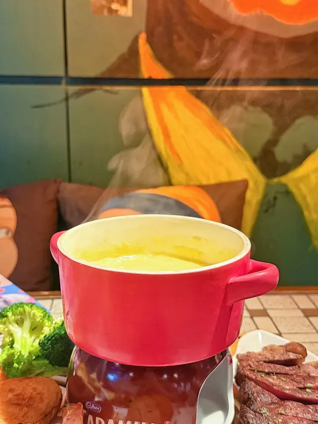 瑞士名物芝士火鍋🧀,芝士好濃稠,配料有西蘭花、麵包、牛扒、蝦同埋薯仔,牛扒係用西冷牛扒,牛味濃郁。罪惡感100但滿足感10000💯