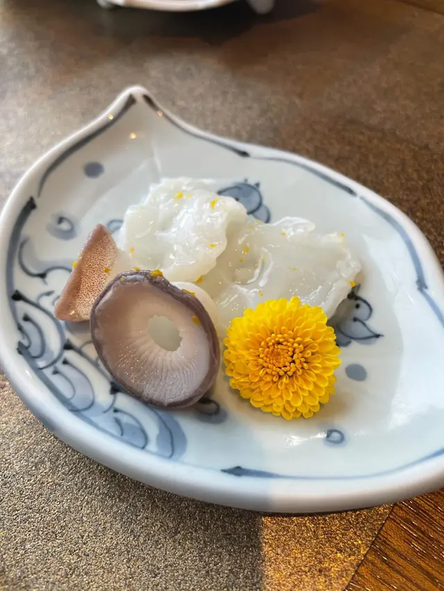 師傅拎咗成條手臂好長嘅水八爪魚出嚟,輕輕將佢設成一片片,拍一下八爪魚即刻會收縮,睇得出非常新鮮,仲有吸盤,平時都好少見,加咗少少柚子調味,食落有海水香。