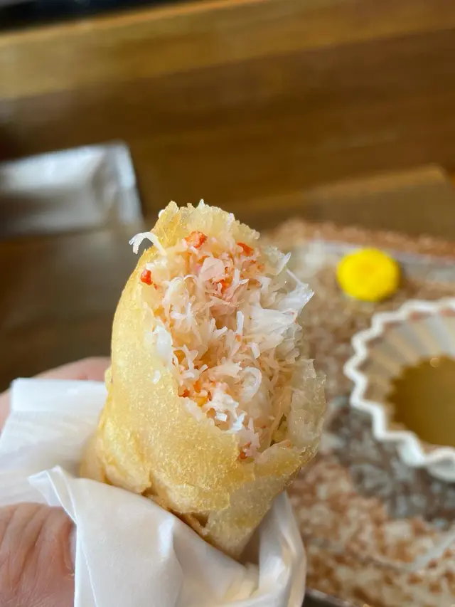 超好食,睇落去平平無奇只係春卷,拎上手嗰陣熱辣辣,咬落去就會見到一絲絲蟹肉🤓啲餡料係爆曬,好多好多蟹肉,可以點少少蟹麵豉醬撈埋就會更加好食!