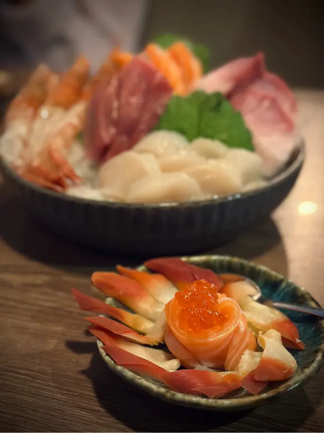 小碟裡的是肥美邊位 配上三文魚籽及北寄貝