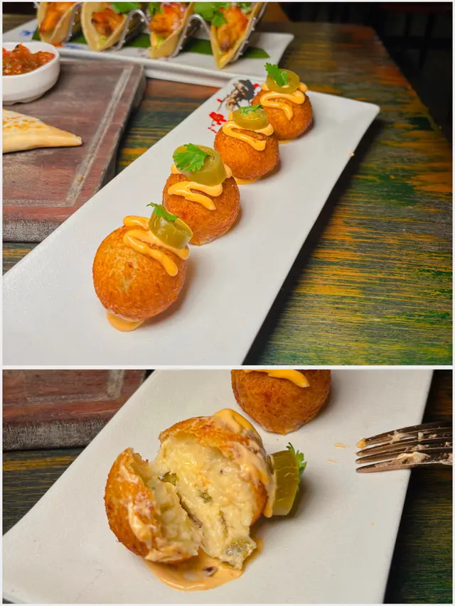賣相非常精緻的圓球,一咬開裡面是滿滿的流心芝士,口感濃郁。墨西哥青椒帶來明顯的辣勁,搭配辣芝士醬更是雙重刺激,愛吃辣的人會非常過癮。