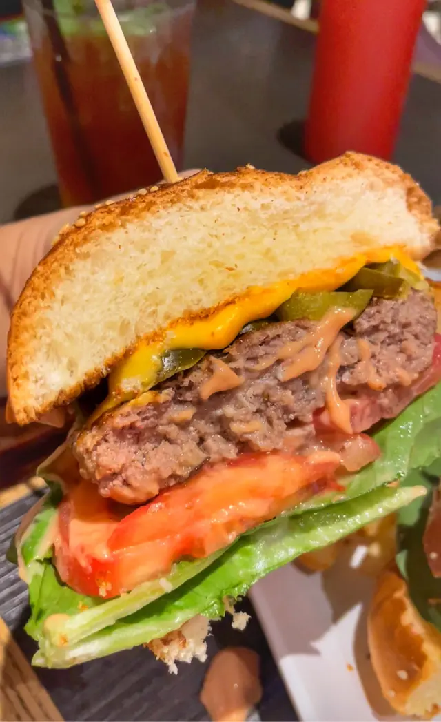 🌟尖沙咀-工業風 正宗漢堡店 yiprachel等级42024-05-1087 浏览 关注 被店面擺放的輪軚裝飾吸引左,喜歡車的老公見到話過去睇吓食乜,見到呢間漢堡店Menu仲有素食選擇啱曬所以入去試吓,呢度素食漢堡都好多選擇,有啲仲可以加$轉做impossible meat素牛肉。Lunch time 有套餐,配直薯條& 飲品(跟餐仲可以加錢配啤酒🍻/ 特飲)。直薯條即炸熱辣辣,食落好香脆。🔶墨西哥辣椒芝士牛肉漢堡🍔🔶一上枱見到個Burger好大個😍,牛肉漢堡好厚,煎香後仍然保持到肉汁豐富,配搭埋芝士、蕃茄、生菜等,醬汁有少少似千島醬味道,加埋個墨西哥辣椒幾惹味,整個配搭好豐富。墨西哥辣椒芝士牛肉漢堡🔶菠蘿大烤菇漢堡🍔🍀🔶素食嘅老公揀咗呢個Burger,又係大大份,大啡菇烤得好juicy,配搭菠蘿🍍、牛油果醬、蕃茄、生菜等,食落好清新口感層次亦很豐富。🔹蜜桃冰茶🔹🔹熱即磨咖啡🔹以上食记乃用户个人意见 , 并不代表OpenRice之观点。赞好分享🌟尖沙咀-工業風 正宗漢堡店 Burgeroom (美麗華廣場1期) https://s.openrice.com/QrLT0IaDJ00检举 张贴 评分5味道5环境5服务5卫生4抵食推介美食墨西哥辣椒芝士牛肉漢堡用餐日期2024-05-02用餐途径堂食用餐时段午餐