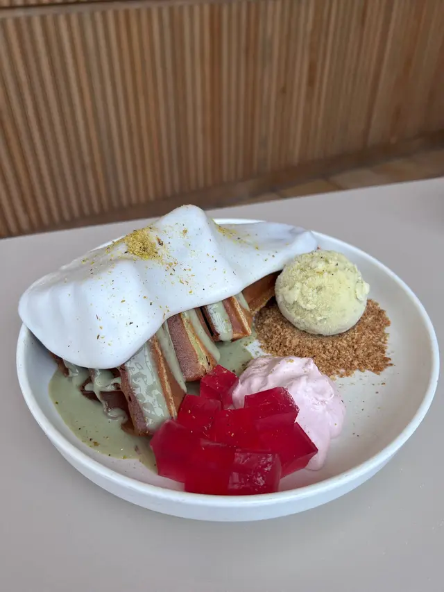 即叫即製窩夫外脆內軟,開心果醬多到漏~