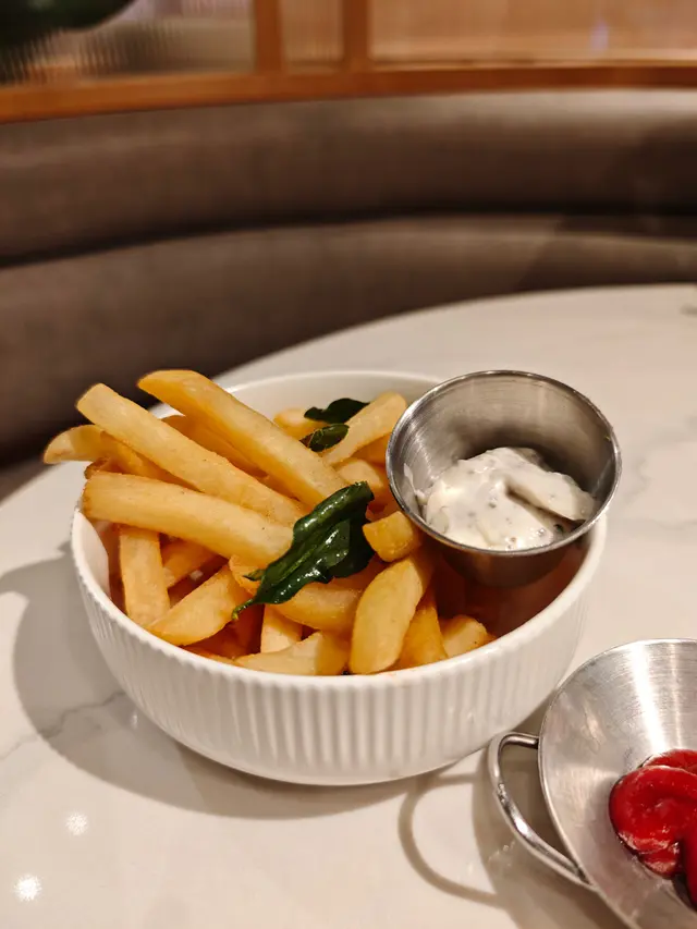 粗薯條炸得金黃脆口,薯條沾上黑松露沙律醬,濃濃的黑松露,份量多,超滿足!