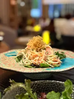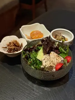 大碗沙律配新鮮火龍果塊,旁邊搭芝麻小魚乾、漬物、蜜漬南瓜三小碟~沙律菜脆嫩爽口,火龍果清甜多汁,小魚乾鹹香帶芝麻香,漬物酸甜解膩、南瓜綿密蜜甜,開胃又清新。