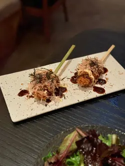 •西班牙黑豚秋葵:串著秋葵,外皮焦香,黑豚肉嫩、秋葵酥脆,帶淡淡香料香。