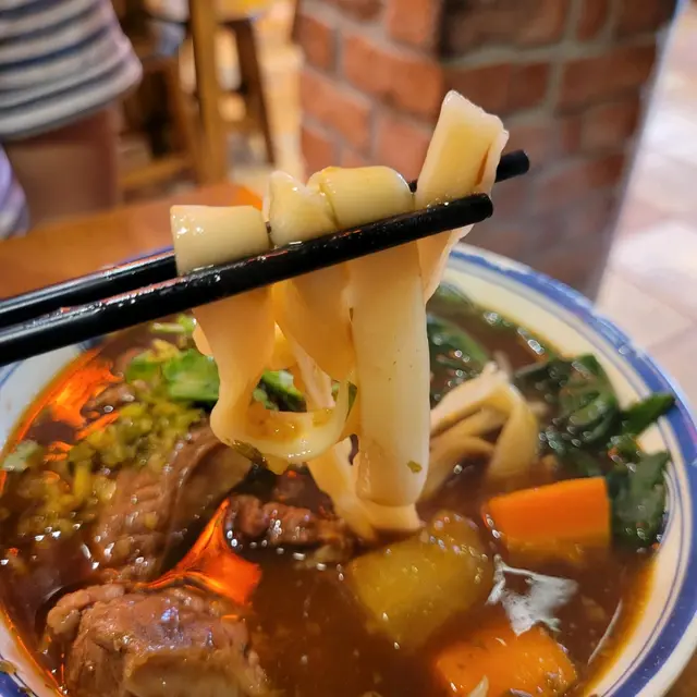 刀削麵條十分粗厚,充滿著煙靭的口感很有咬口,吸收到一點湯汁,邊啜湯邊吃麵是最棒的。