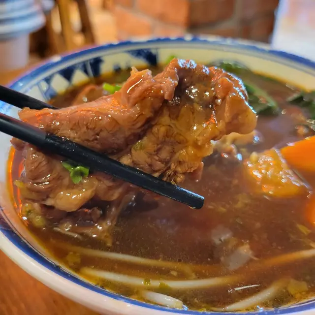啡紅色的湯底看起來特濃,喝下去帶點香的藥材類味道,甘甜濃稠卻不會覺得膩。牛腩還是大大條的舖在頂上,還有蘿蔔等蔬菜,頗為豐富。