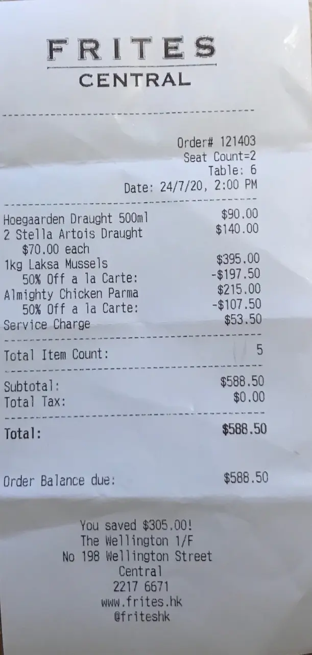 雖然話兩碟食物半價,嗌左三杯啤酒,買單都差唔多要$600⋯⋯ 如果正價嘅話要成$900!真係超唔抵啦!