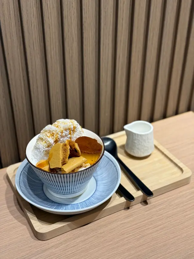 焦糖布甸刨冰個冰本身冇味,可以自己倒椰汁調味,仲有超多焦糖脆脆~