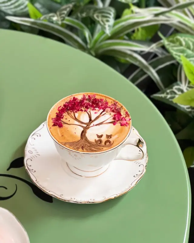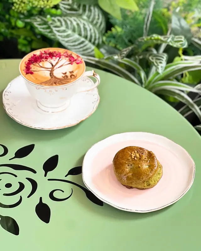 即系𝑅𝑜𝑠𝑒 𝐿𝑎𝑡𝑡𝑒🌹之前上網見到呢度紫薯鮮奶🍠玫瑰咖啡都整得十分唯美✨所以叫玫瑰咖啡試試。拉花圖案系一棵樹🌳然後樹上灑滿玫瑰花瓣,打卡度十足📷玫瑰味清香解膩❤️