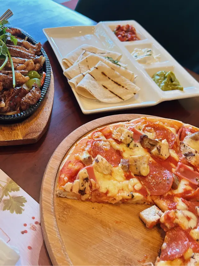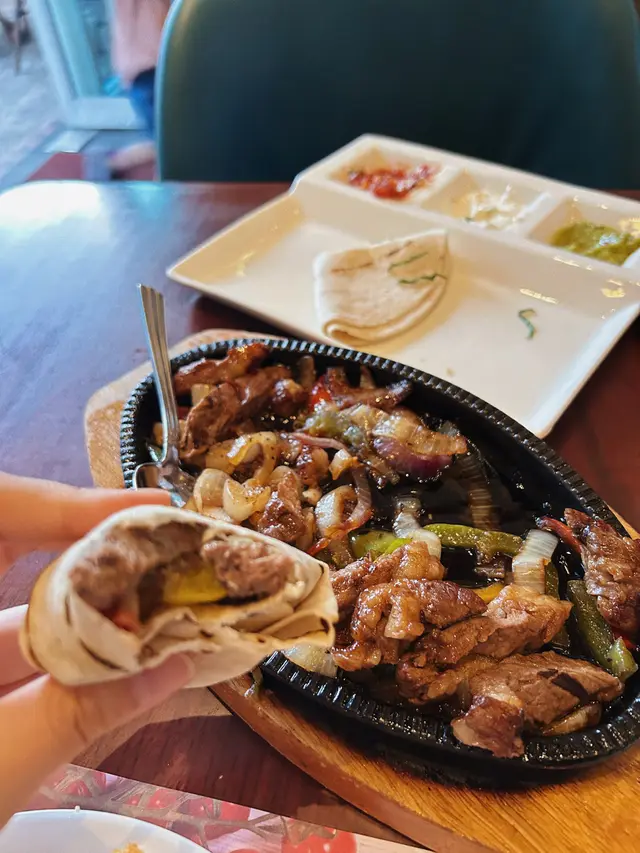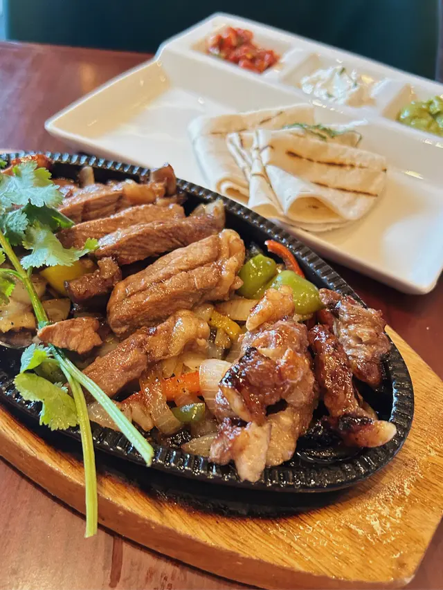 fajitas係墨西哥菜式 上來會見到有個鐵板 鐵板上面有切成一條條嘅肉眼牛扒 仲未煎到熟曬 入面肉色仲係粉嫩嘅充滿飽滿嘅肉汁!用洋蔥同甜椒炒完之後係鐵板繼續轟出牛肉嘅香氣😋仲有一碟上面有4塊墨西哥捲餅 隔離有3種醬 分別係牛油果泥 酸忌廉同番茄莎莎醬 食嗰陣攤開餅皮擺D肉同埋甜椒洋蔥入去 再搽D醬汁之後包成一個捲嘅樣一啖咬落去 充滿著BBQ肉同埋香料嘅味道 好滿足😍