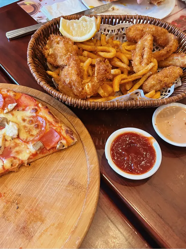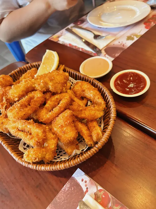 呢度嘅海鮮大會一開始我仲以為係就咁煮出來 原來係炸物雜燴(海鮮版)配有半個檸檬可以擠D汁清香D 仲有千島醬同茄汁可以點 分別係魚柳 魷魚圈 蝦同埋薯條 不過海鮮入面冇乜味 但係薯條就好正!薯條係幼身 但係超脆同埋鹹味好突出好正!彎曲嘅外表配上外面嘅炸粉有小小辣令人停唔到手🤣