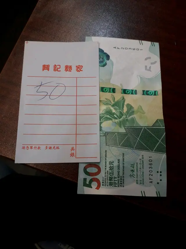 因為「興記麵食家」店舖裡面的侍應工作也尚算勤快,不斷出入來回「興記麵食家」主舖廚房跟旁邊舖位,食客食完飯直接在舖內呼喚「埋單」,很快就有侍應前來結賬和收錢了。